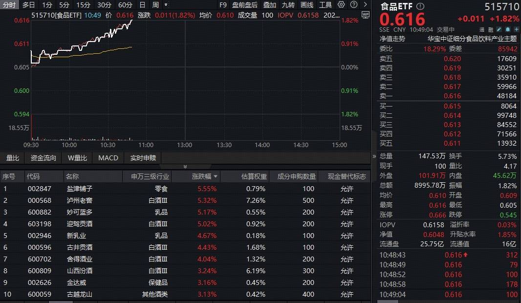 成份股方面,部分白酒龙头及大众品涨幅居前,截至发稿,泸州老窖、迎驾贡酒、盐津铺子、妙可蓝多等大涨超5%,舍得酒业、古井贡酒、新乳业等跟涨超4%,山西汾酒、贵州茅台、五粮液、洋河股份等亦涨幅居前。